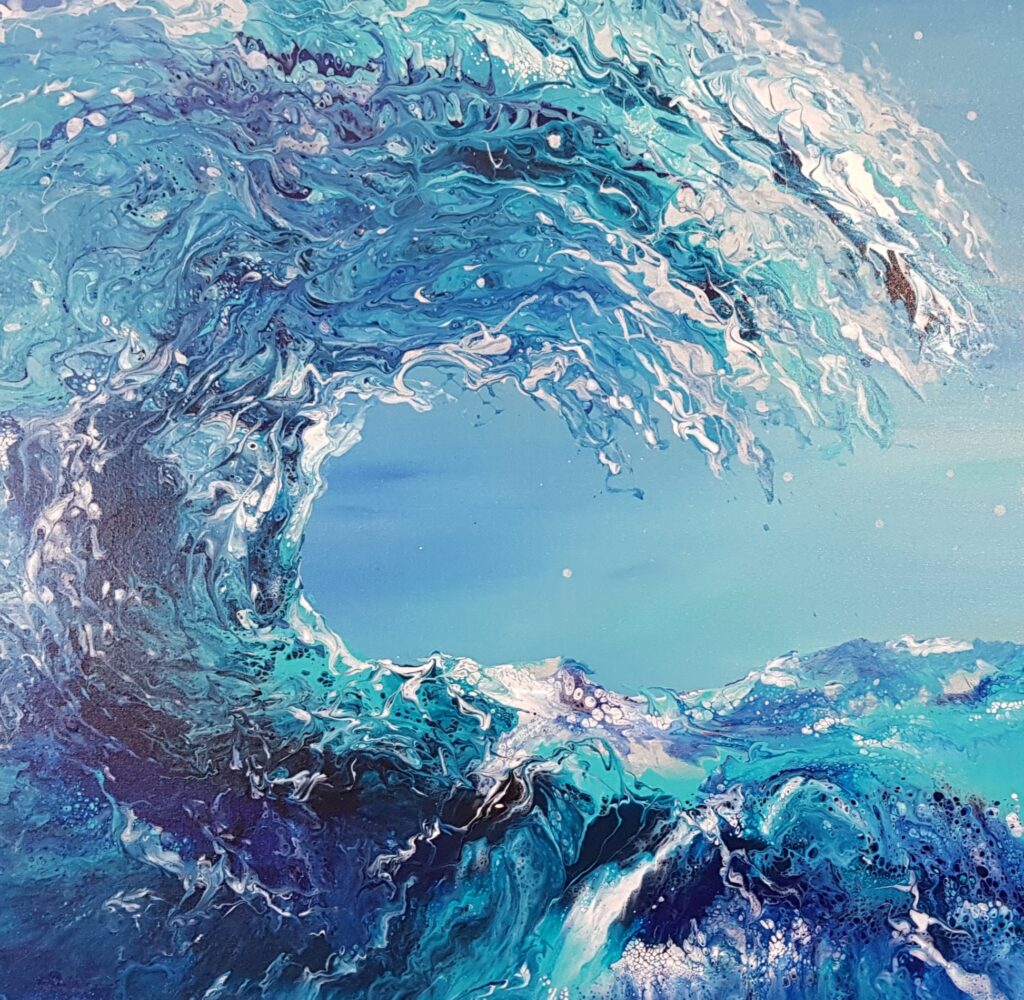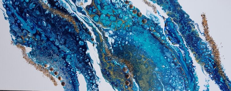 Alongside her shell work, Donna also creates large acrylic pour paintings. These bold, expressive works explore abstract and botanical forms, as well as dynamic coastal scenes with crashing waves and foreshore energy. Rich in movement and colour, they capture the essence of ocean life in striking indoor art pieces.