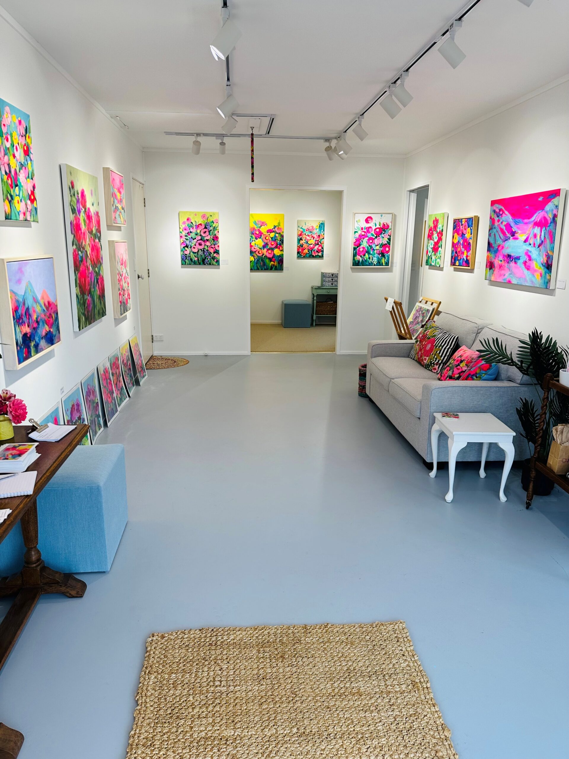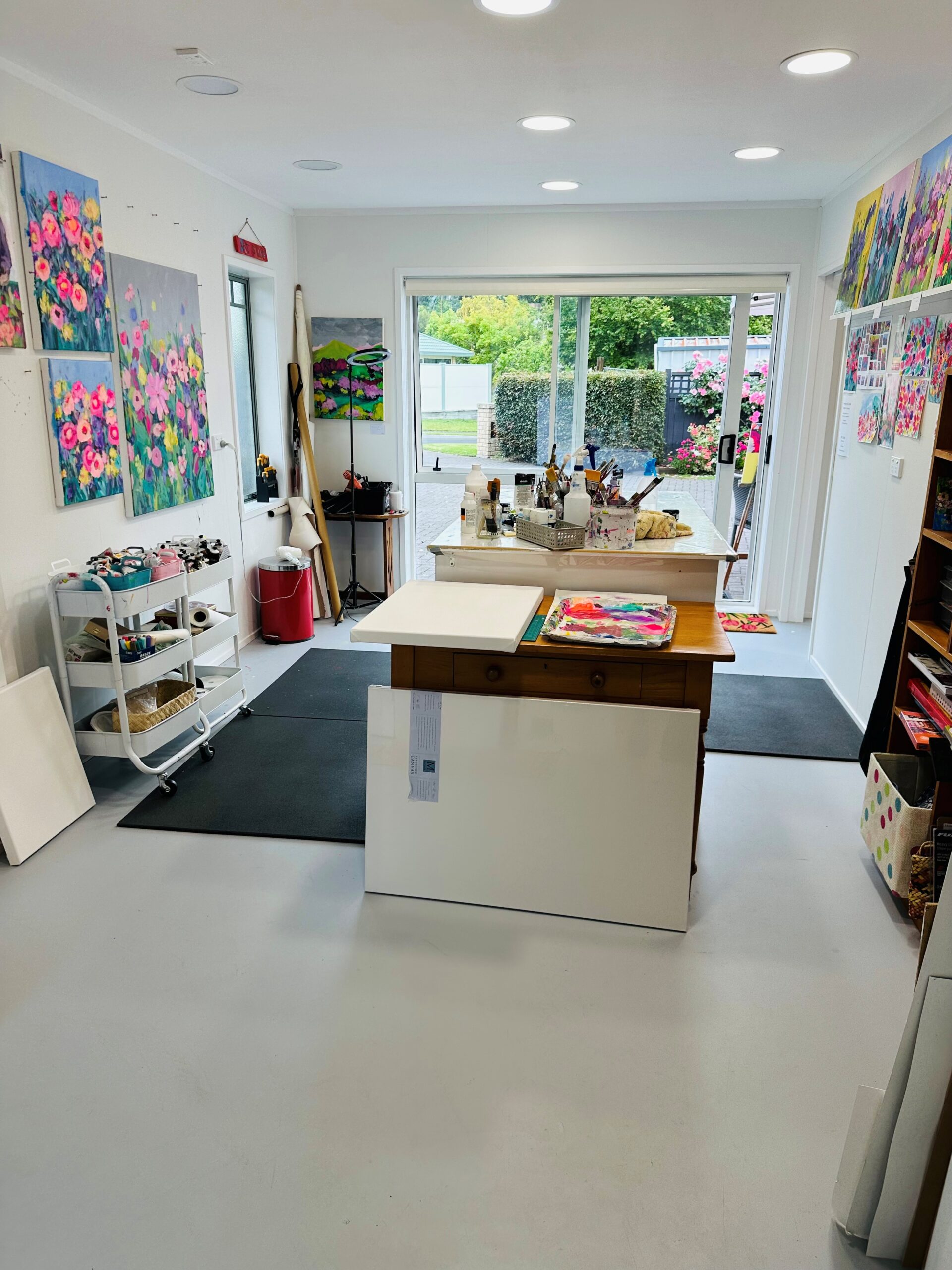 The studio occupies the front of Nicola’s home, originally a double garage now converted into a light, airy workspace and gallery. Large sliding doors allow easy entry from the street, and the space is divided into two open-plan areas, one for working and one for displaying her art.